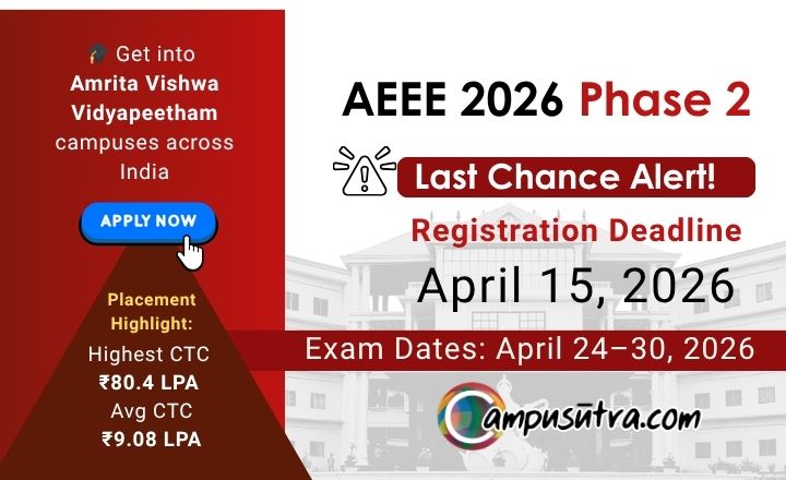 AEEE Registration: The Amrita Vishwa Vidyapeetham has issued a final reminder for engineering aspirants regarding the Amrita Entrance Examination – Engineering (AEEE) 2026. The registration window for Phase 2 is set to close on Apr 15, 2026. This serves as the final opportunity for students seeking admission to B Tech programs across Amrita’s campuses in Coimbatore, Amritapuri, Bengaluru, Chennai, Amaravati, Faridabad, Haridwar and Nagercoil.