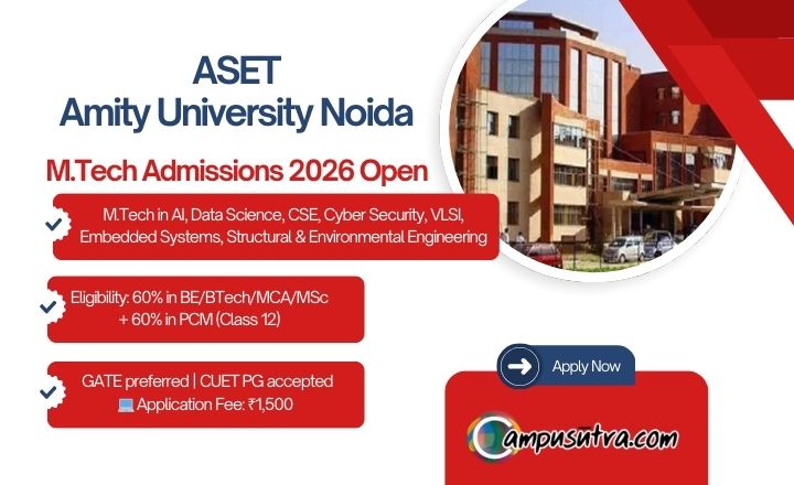 Amity University Noida M Tech Admission 2026: The Amity School of Engineering and Technology (ASET), Amity University Noida Opened their applications for the M Tech Admission 2026 batch. Candidates can apply Online. Amity University Noida is one of the leading and high ranked Universities in India. ASET offers more than fifty eight Programmes of which twenty seven are the B.Tech Programmes, one B.Tech + M.Tech Dual Degree Program, four B.Tech + MBA Dual Degree Programmes, twenty M.Tech Programmes.