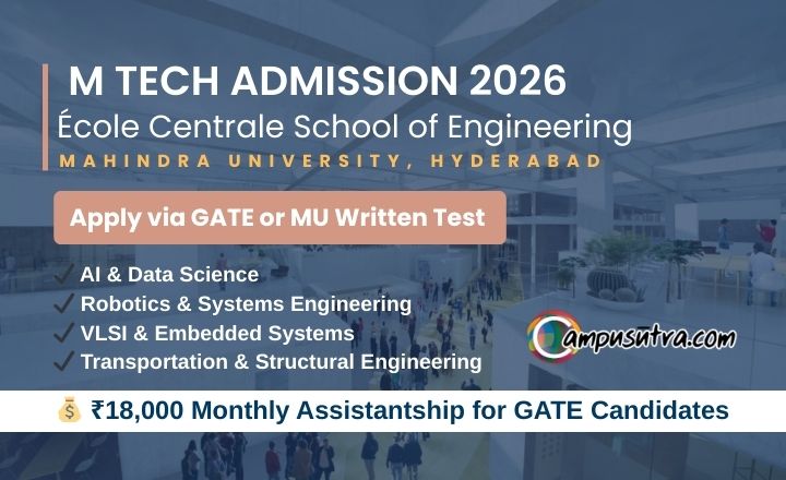 M Tech Admission 2026: The Admissions for the M.Tech 2026 session at École Centrale School of Engineering, Mahindra University, Hyderabad are currently open. The university offers a research-centric, interdisciplinary approach in partnership with the École Centrale Group of France. Candidates can apply Online.
