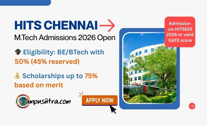 HITS Chennai M Tech Admission 2026: The Hindustan Institute of Technology and Science (HITS), Chennai opened their Application for M Tech Admission 2026. The university is well-known for its strong focus on Aerospace and Aviation specializations. HITS offers scholarships up to 75% based on HITSEEE scores and academic merit. Candidates can apply online.