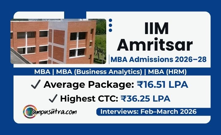 IIM Amritsar MBA Admission 2026: The IIM Amritsar opens application for its 2 year full time MBA, MBA BA & MBA HRM Programme for the batch 2026 -28. Admission for the MBA 2026-28 batch at IIM Amritsar (Indian Institute of Management Amritsar) is primarily based on the CAT 2025 score. The institute has released its latest selection criteria, which emphasizes a balance between entrance exam performance, academic consistency, and personal interview skills.