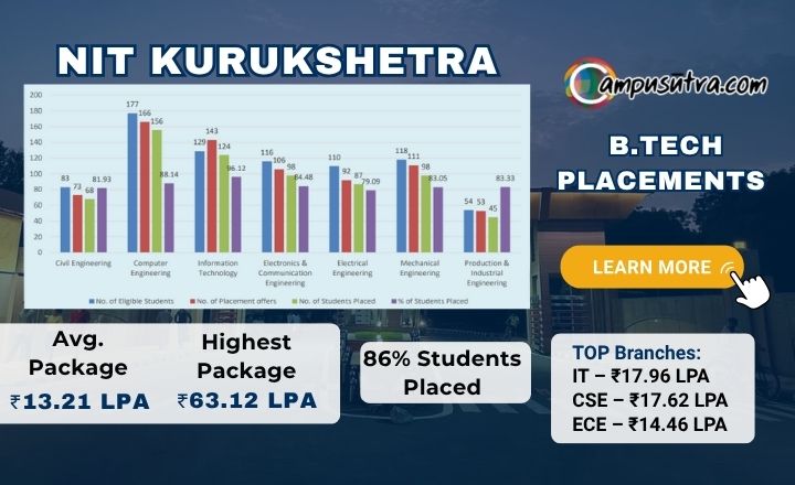 NIT Kurukshetra B Tech Placements 2025: The National Institute of Technology Kurukshetra (NIT Kurukshetra) released the final placements for the B Tech batch 2025. The average salary package for B.Tech students offered was Rs. 13.21 Lakh per annum and the. The highest package offered was Rs. 63.12 Crore per annum.