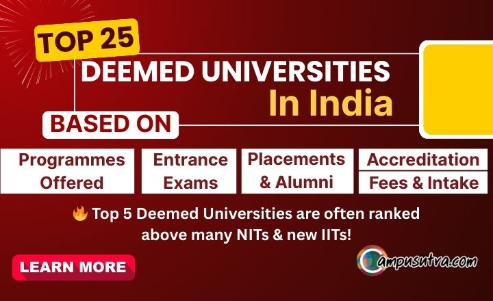 If you are searching deemed university in India, here is the list of top 25 deemed university ranking by campusutra on the basis of program offered, seat, exam accepted, placement, accreditation and other facts. If you are find deemed university for under-graduate program (B.Tech, B.E, B.Sc, BCA, BBA, B.Pharma and others), PG (M.Tech, MBA, MCA, ME, M.Sc and others).