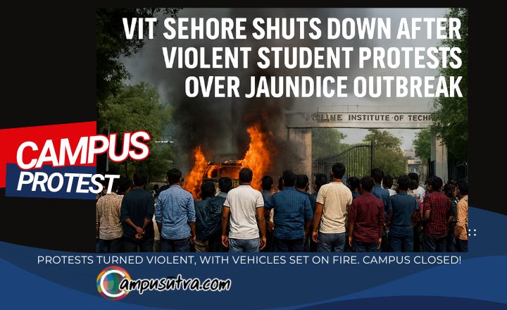 Sehore, Nov 26: Student unrest at Vellore Institute of Technology (VIT) University’s Sehore, Bhopal campus spiraled into violence late Tuesday night, with a bus and car set ablaze amid allegations of unhygienic food and water leading to a jaundice outbreak.