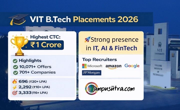 VIT Vellore Placements 2026: VIT (Vellore Institute of Technology) Vellore released the B Tech Placement report for the batch 2022 -26. The placement season for the B.Tech 2026 Batch at VIT Vellore has already set a new benchmark, reinforcing its reputation as one of India’s premier recruitment hubs. This year’s highest package offered is Rs. 1 Crore per annum.