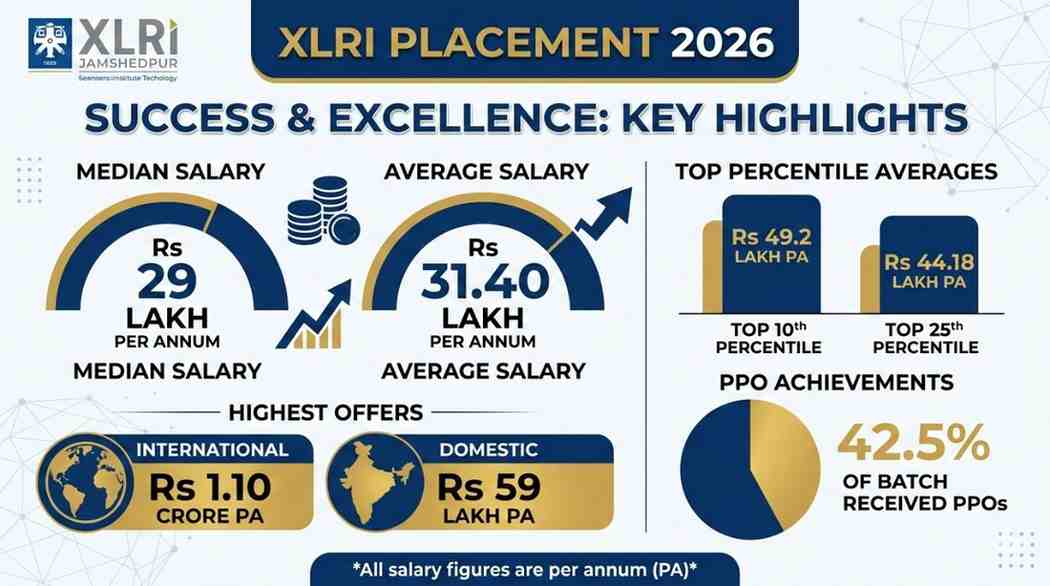 XLRI Placement 2026: XLRI Jamshedpur and XLRI Delhi NCR have completed the final recruitment process for the 2024-2026 PGDM (BM) and PGDM (HRM) batches. Around 42.5% of the batch received Pre-Placement Offers (PPOs) based on their summer internship performance.